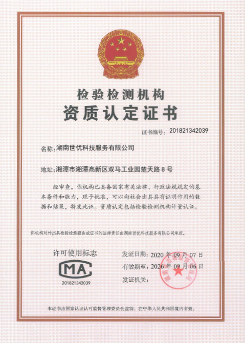2020年9月,世優(yōu)科服已順利取得了由湖南省市場監(jiān)督管理局頒發(fā)的檢驗檢測機構(gòu)資質(zhì)認定證書(證書編號201821342039),標志著公司在技術(shù)能力和質(zhì)量管理方面都達到RB/T214-2017《檢驗檢測機構(gòu)資質(zhì)認定能力評價檢驗檢測機構(gòu)通用要求》的要求。