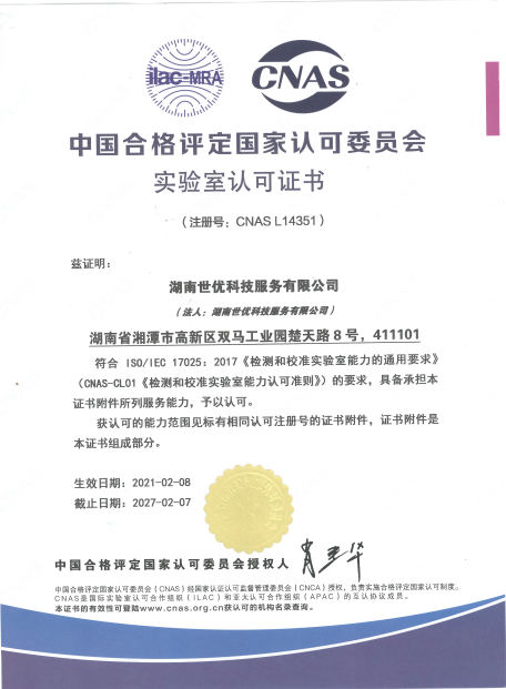 2020年9月,世優(yōu)科服已順利取得了由湖南省市場監(jiān)督管理局頒發(fā)的檢驗檢測機構資質(zhì)認定證書(證書編號201821342039),標志著公司在技術能力和質(zhì)量管理方面都達到RB/T214-2017《檢驗檢測機構資質(zhì)認定能力評價檢驗檢測機構通用要求》的要求。